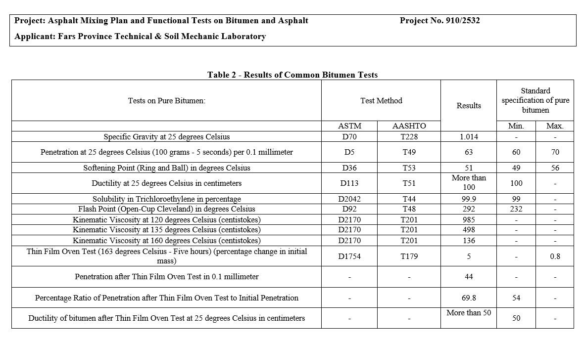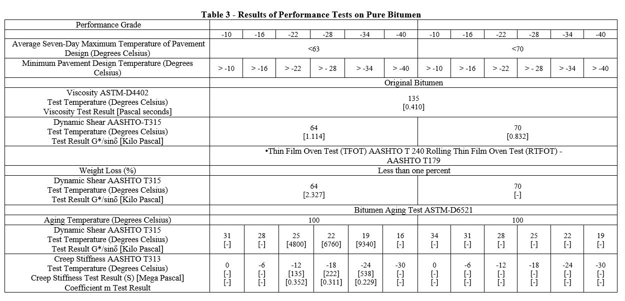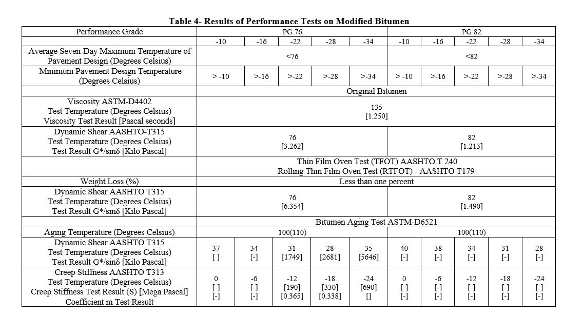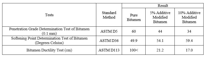 Performance tests were conducted on the submitted pure and polymer-modified bitumens as follows, and the results for pure and polymer-modified bitumens are presented in Tables Number 3 and 4, respectively: