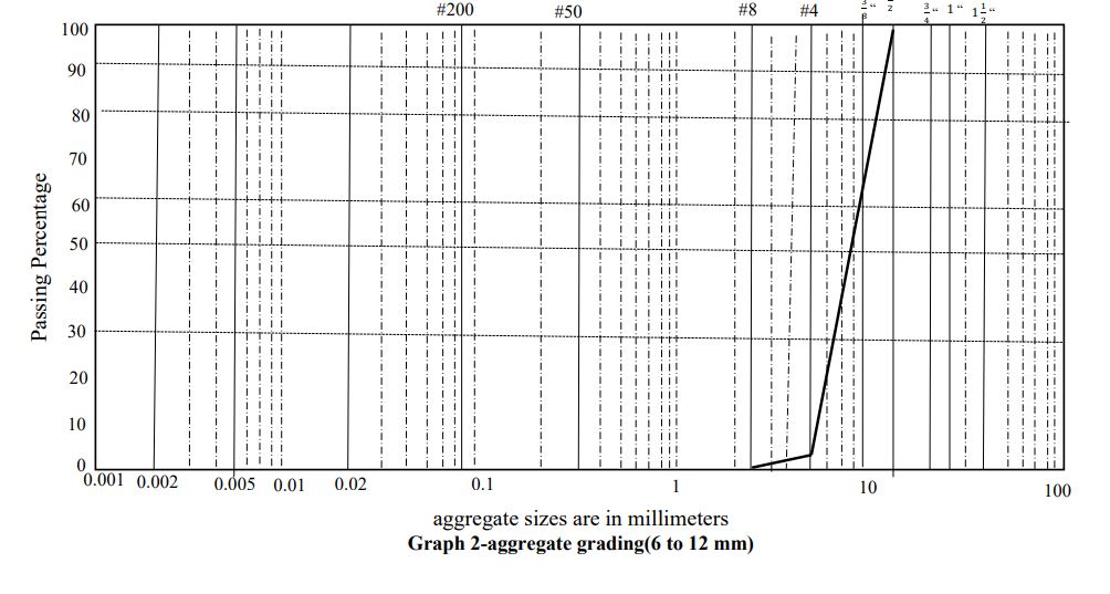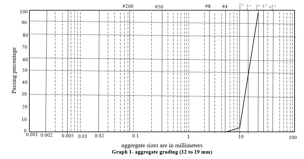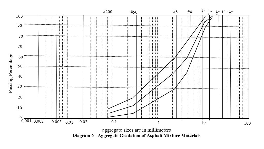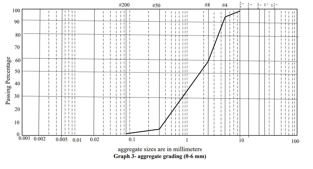 Samples were prepared and constructed based on the median grading limit of No. 4 from the “Asphalt Mixtures continuous gradation table” using the aggregate material mixture. The aggregate material mixture curve used in the plan, according to the grading range of No. 4 in the mentioned table, is plotted in graph No. 6