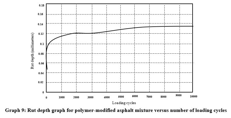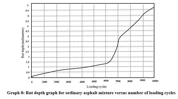 In this device, the loading wheel moves back and forth on the sample surface under dry or submerged conditions. The samples used in this device have dimensions of 30x30x5 centimeters. The loading wheel of the device has a diameter of 20 centimeters and a width of 5 centimeters. The samples were compacted using a roller compactor, employing a rubbing method for compaction. The asphalt mix slab samples were submerged in water at 50 degrees Celsius, with a wheel load of 705 Newtons and a reciprocating speed of 50 cycles per minute, undergoing 20,000 wheel passes (10,000 reciprocations). The depth of rutting in different cycles for ordinary and polymer-modified asphalt mixes is presented in graphs 8 and 9. The rut depth of the ordinary and polymer-modified asphalt mix samples after 20,000 wheel passes was 6.62 and 13 millimeters, respectively. It is worth mentioning that the ordinary asphalt mix, under the influence of water along the path of the wheel load movement, experienced surface stripping damage, leading to further rutting.