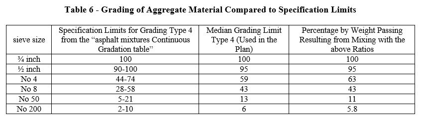 Considering the ratios mentioned in Table 5, the percentage by weight of aggregate material passing through the desired sieves in grading No. 4 of the "asphalt mixtures continuous gradation table” is obtained as follows in Table 6:
