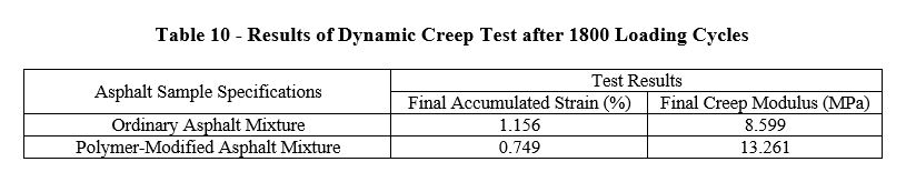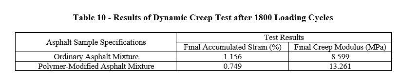 The dynamic creep test of ordinary and polymer-modified asphalt mixture samples was conducted at a temperature of 45 degrees Celsius according to the BS-DD226 standard method. According to the standard, the test duration was 3600 seconds, during which 1800 loading cycles were applied, with a loading duration of one second at 100 kPa pressure in each cycle. Additionally, in this test, a pre-loading stress of 12 kPa is applied for 120 seconds before the test cycles. The results of the tests are presented in Table 10.