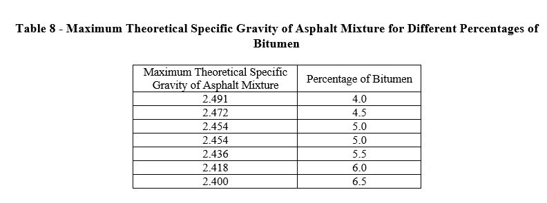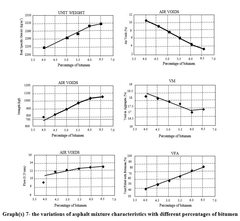 The percentage of compacted asphalt mixture air voids, percentage of voids in mineral aggregate (VMA), and percentage of voids filled with bitumen in mineral aggregate (VFA) were calculated based on the calculations outlined in MS-2 Asphalt Institute manual. The curves showing the variations of the above quantities with different percentages of bitumen are plotted in a series of graph(s) numbered 7.