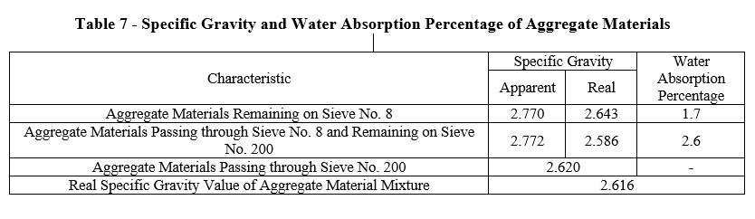 Tests for determining the real specific gravity, apparent specific gravity, and water absorption percentage of the remaining aggregate materials on sieve No. 8 according to AASHTO-T85 standard, and the materials passing through sieve No. 8 and remaining on sieve No. 200 according to AASHT-T100 standard were conducted. The results of these tests, along with the real specific gravity value of the aggregate material mixture, are presented in Table 7.