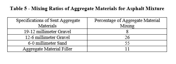 Based on the results obtained from the grading of aggregate materials and in order to achieve the median grading limit of No. 4 in the "table of Asphalt Mixtures Continuous Gradation", the mixing ratios of aggregate materials have been determined according to Table No. 5